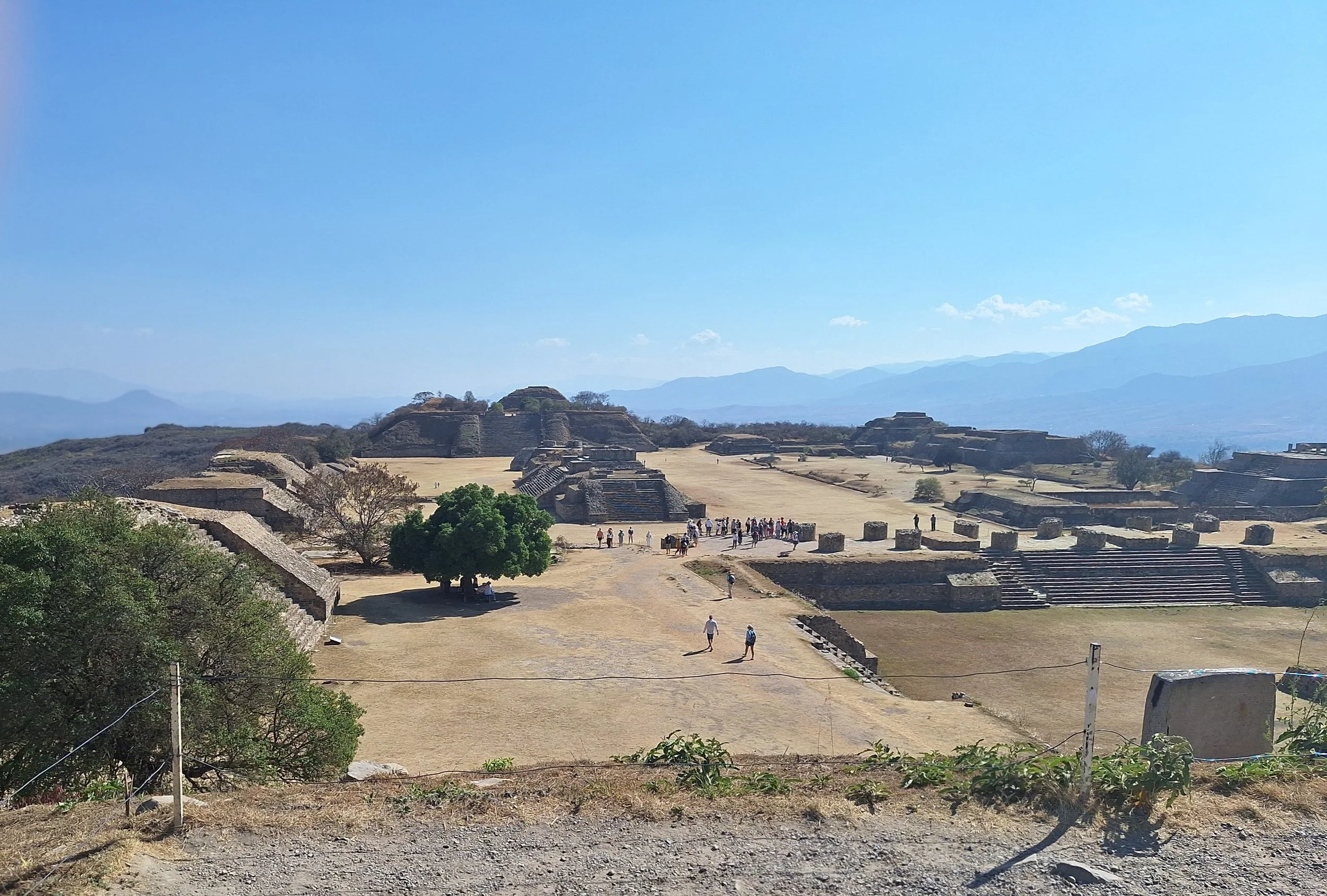 It was a winding nine-kilometer and thirty-minute bus ride from the Zócalo that transported us through time to la zona arqueológica de Monte Albán. Situated atop a 1,400-foot-high peak overlooking the three Valles Centrales that converge at what is now Oaxaca de Juarez,[1] Monte Albán was one of the earliest Mesoamerican cities. For over a millennium, from roughly 500 BCE to CE 700, it flourished as the religious, economic, and political capital of the Zapotec people who ruled this region while maintaining a precariously peaceful coexistence with the Aztecs to the north and the Mayas to the east.