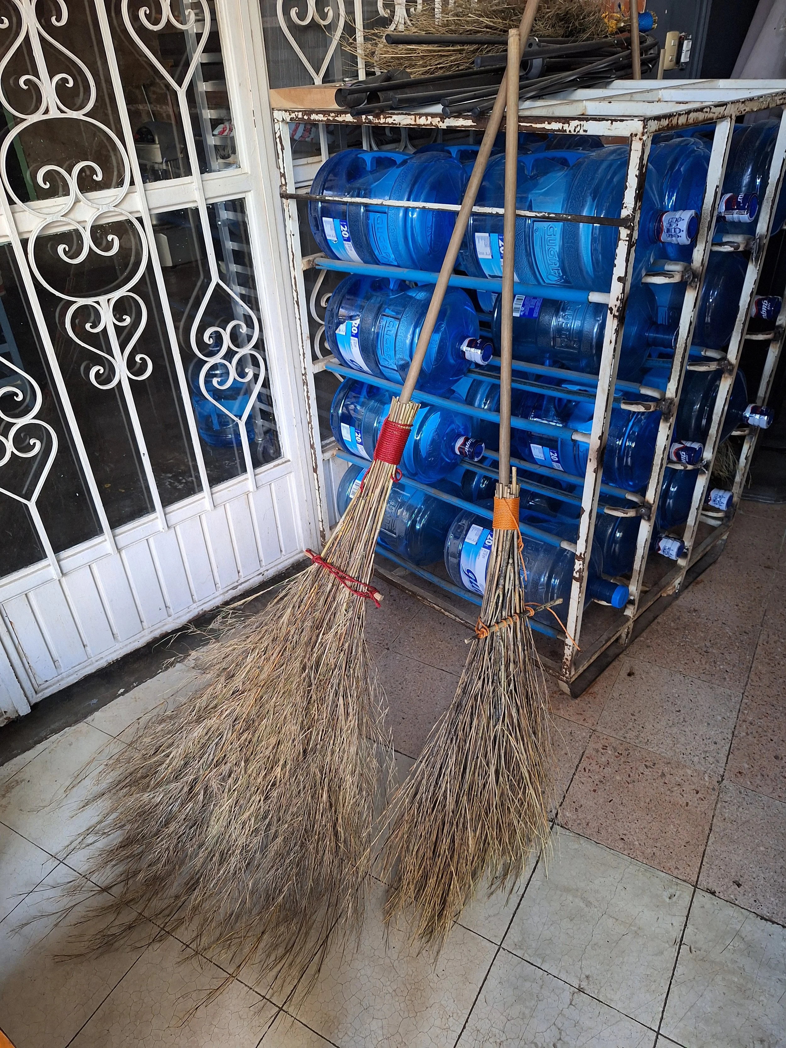 The barrenderos can be identified by the fluorescent orange safety vest they wear and the weapon they brandish in the battle to restore order, la escoba de otate, a long-bristled broom made from the stalks of the Mexican weeping bamboo. The stalks of Otatea acuminata, a drought-tolerant bamboo native to central and southern Mexico, tend to bend or weep from the weight of their leaves. These stalks are harvested and bound with twine to a broomstick, forming a long curving pushbroom that makes a wide swath, reaching into corners and crevices, especially effective on the city’s many cobblestone streets.