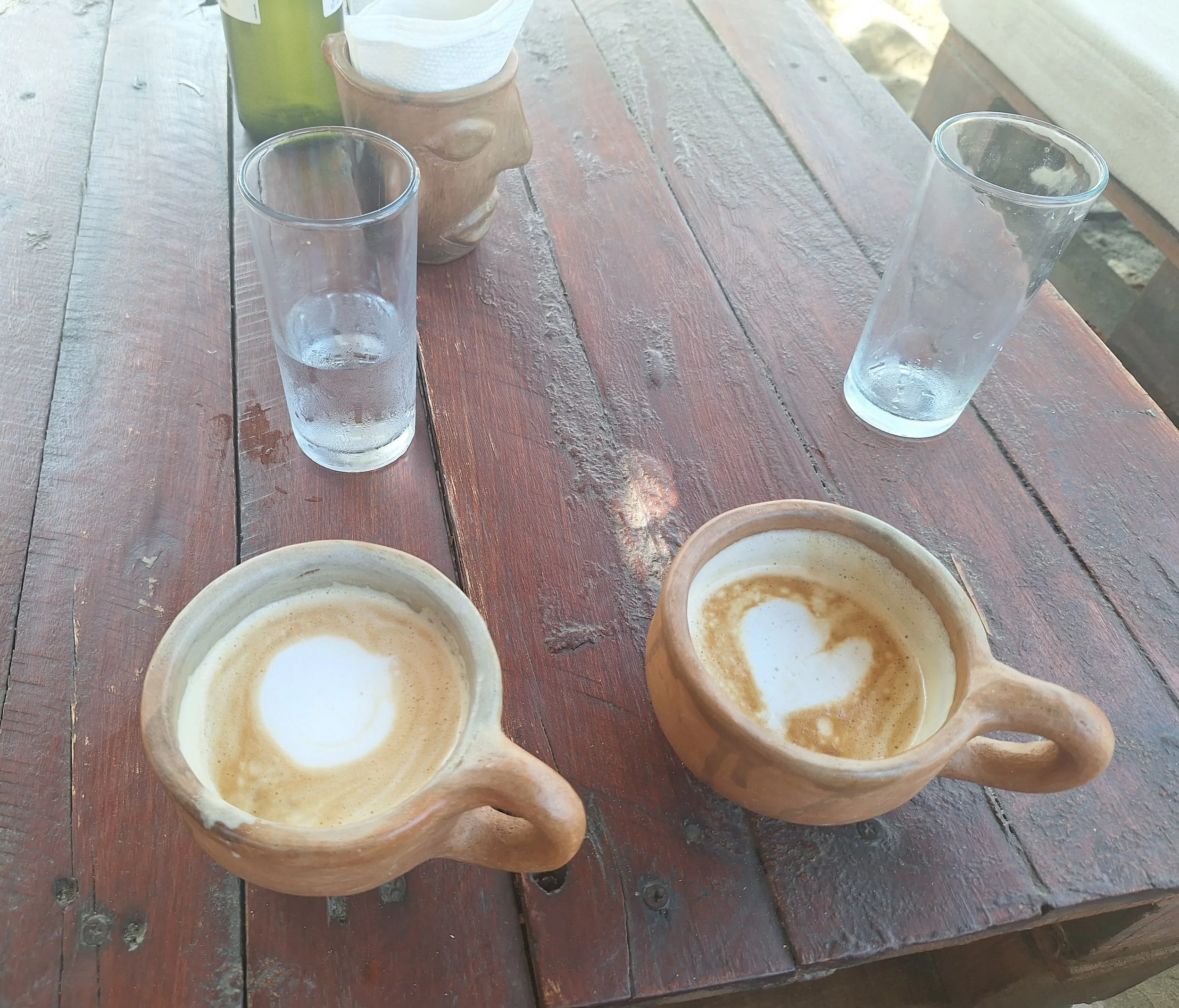 Soon, two cups of latte arrived in thick handmade clay mugs, two hearts in foam. In the open-air kitchen five steps away, two chefs were creating their art. We were served bowls of acai, topped with an elegant array of sliced bananas, mangos, and apples, sprinkled with grated coconut, dried cherries, almonds, granola, and pepitas. It was as nourishing as it was aesthetically pleasing.